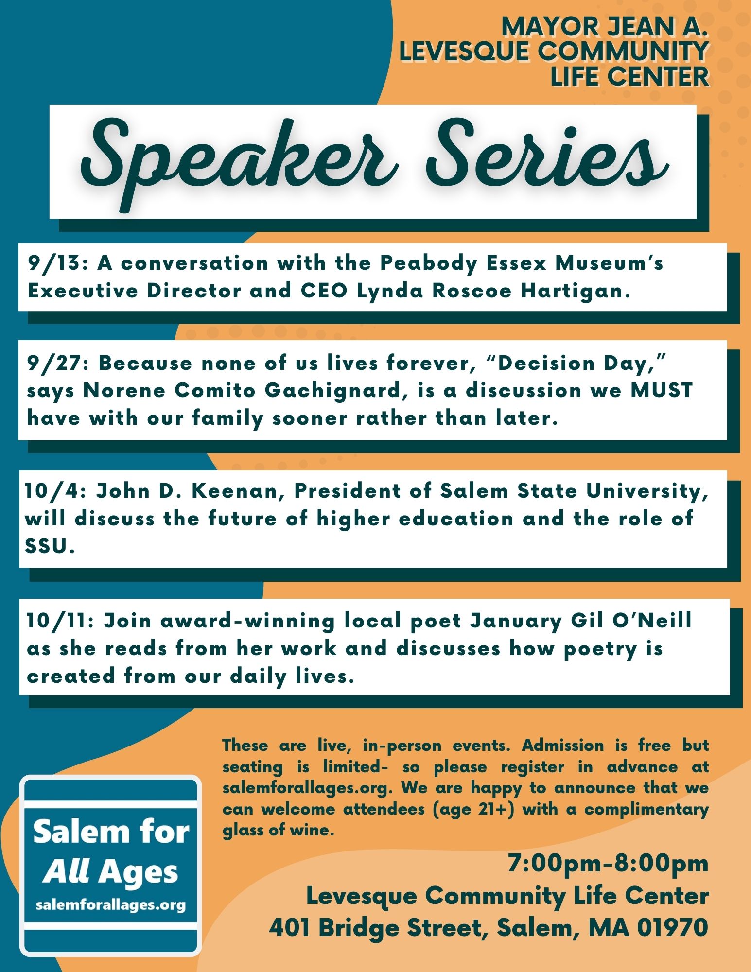 Levesque Community Life Center 401 Bridge St Salem MA 01970-2276 Posted on August 29 2020 by. All Speaker Series events will take place live in the Mayor Jean A. Operating Hours per Week.